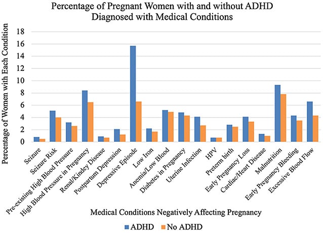 Som vi allerede har nævnt, er der mange medicinske tilstande, der kan diagnosticeres under graviditeten, og nogle af dem kan være meget farlige for både mor og barn. Selv om hver enkelt tilstand er kompliceret, omfatter de generelle farer højt blodtryk, depression, lavt iltindhold i blodet, højt blodsukker, infektioner, tidlig fødsel og blødning [3]. I figur 1 kan du se, at de fleste af de farlige medicinske tilstande, som vi har sporet, forekommer oftere i gruppen af gravide kvinder, der er diagnosticeret med ADHD, end i gruppen uden ADHD. Det betyder ikke nødvendigvis, at ADHD forårsager disse tilstande, men det er muligt, at der er nogle symptomer eller træk ved ADHD, som gør disse kvinder mere sårbare over for at udvikle disse andre tilstande. For eksempel kan den glemsomhed og impulsivitet, der er forbundet med ADHD, gøre en kvinde mindre tilbøjelig til at huske at undgå ting, der kan gøre hende syg under graviditeten, som f.eks. at skifte kattebakken. Disse oplysninger viser, at vi bør forske mere i ADHD, og hvordan det påvirker en persons generelle helbred.