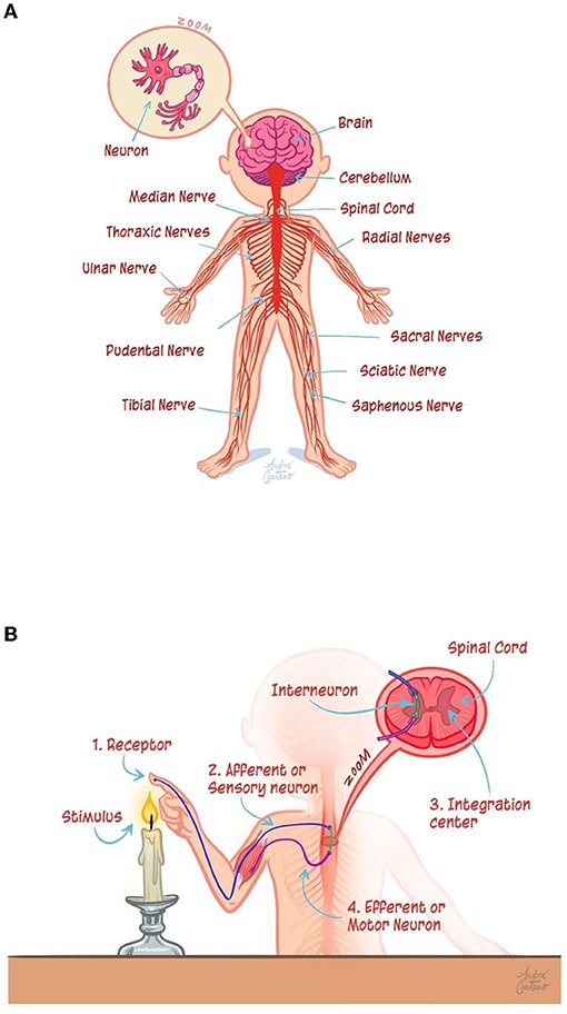 Hjernen og rygmarven styrer hver eneste lille ting, vi gør, såsom at tænke, bevæge os, føle og lære. De styrer endda ting, vi ikke er bevidste om, såsom hjerteslag, vejrtrækning og fordøjelse. Men de kan ikke gøre det hele alene! Hjernen og rygmarven er forbundet med hvert organ og hver muskel via celler, der kaldes neuroner. (figur 1A).
