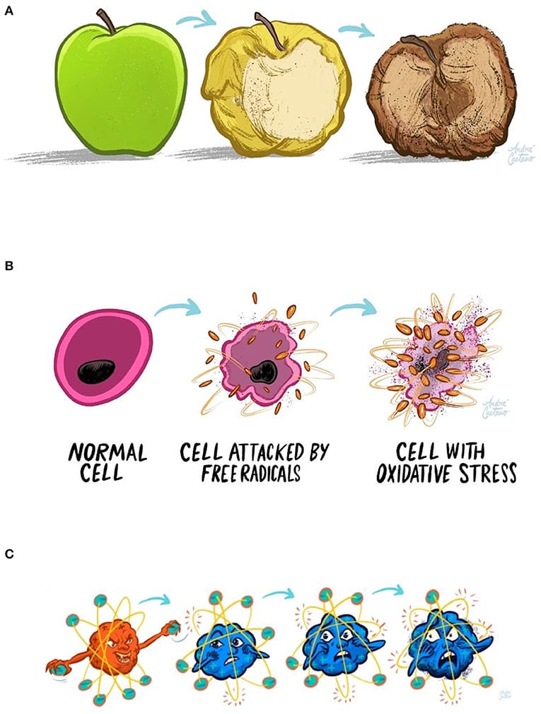 Oxidation er en naturlig proces, der sker, når noget er i kontakt med ilt, f.eks. når man skærer et æble over og lader det være i kontakt med luften i timevis (figur 3A). Noget lignende sker inde i vores celler, når cellulære komponenter er i kontakt med reactive oxygen species (ROS), ROS er molekyler, der stjæler elektroner fra andre molekyler. Under normale forhold er ROS vigtige for at kontrollere kritiske cellulære processer. Men når der produceres for store mængder ROS, og vores celler ikke kan håndtere dem, begynder ROS at beskadige vigtige cellulære komponenter, herunder mitokondrier. Dette kaldes oxidativ stress og det kan dræbe celler (figur 3B, C).