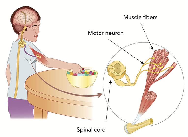 En atlet, der løber. Et barn, der griber et stykke slik. En lærer, der taler. En person, der spiser. Hvad har alle disse mennesker til fælles? De laver bevægelser, ofte uden at tænke over det. Det virker nemt at bevæge sig. Men det vil måske overraske dig, at der stadig er meget at lære om den måde, vi producerer bevægelse på. At producere bevægelse er en kompleks proces, der involverer mange strukturer i kroppen. Vidste du, at det at gribe om et stykke slik kræver, at din hjerne sender elektriske impulser til mange forskellige muskler? Disse impulser fortæller hver af dine muskler, hvornår og hvor hårdt de skal trække sig sammen. Musklerne skal trække sig sammen på en koordineret måde. Hvis ikke, vil du ikke få fat i dit foretrukne stykke slik. At forstå, hvordan bevægelser opstår, vil hjælpe læger med at hjælpe mennesker med bevægelsesforstyrrelser, og denne forståelse kan også være med til at udvikle træningsstrategier for atleter.