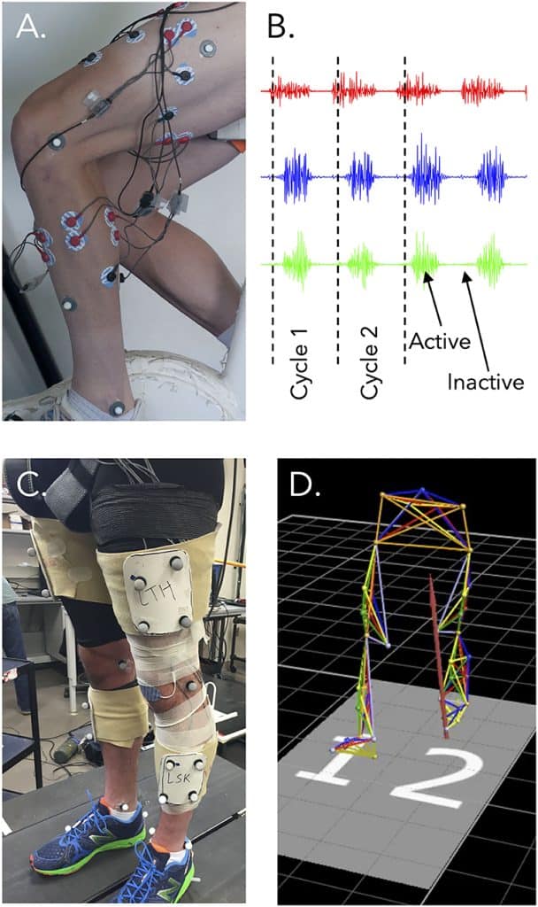 Information om muskelaktivitet er ikke helt nok til at give en fuldstændig forståelse af bevægelse. Det er også vigtigt at forstå, hvordan folk bevæger forskellige dele af deres krop. Hvor meget bevæger dine knæ- og ankelled sig f.eks., mens du går? Vi kan registrere disse oplysninger ved hjælp af en teknik, der kaldes motion capture (Figur 3C,D). Vidste du, at motion capture også bruges i film- og videospiludvikling til at animere figurer? I animation måles rigtige menneskers bevægelser først ved hjælp af motion capture. Dusinvis af reflekterende markører placeres på huden. Derefter spores disse markørers position af kameraer, mens personen udfører forskellige bevægelser. Alle disse bevægelsesoplysninger bruges til at animere de digitale figurer, så deres bevægelser ligner rigtige menneskelige bevægelser. Motion capture bruges på en meget lignende måde af forskere til at måle og beskrive bevægelser.