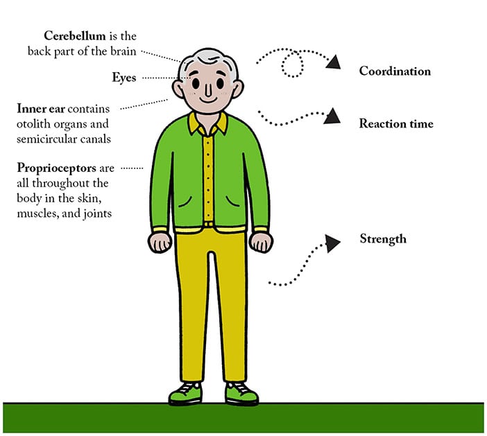 Alle bliver lidt svagere og mere vaklende, når de bliver ældre. Ældre menneskers balancesystemer kan holde op med at fungere så godt, deres reaktionstid kan blive lidt langsommere, og deres muskler kan blive lidt svagere. Det gør folk mere tilbøjelige til at “miste balancen”, glide eller snuble og falde. Derudover kan ældre menneskers syn blive lidt sløret, og hørelsen er ikke altid så skarp. Det kan gøre det sværere at se bump på vejen eller høre ting bag sig, hvilket kan føre til overraskelser, der bringer dem ud af balance. Men det er ikke kun alderen. Visse helbredsproblemer og medicin, ujævne gulve eller rodede rum kan få enhver til at snuble, ung som gammel.