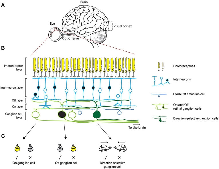 Der findes flere typer ganglieceller, hver med deres egen funktion [1]. For eksempel er der ganglionceller, der reagerer på lysindfald (kaldet On ganglionceller), nogle, der reagerer på lysudfald (kaldet Off ganglionceller), og endda nogle, der reagerer på bevægelse i en bestemt retning (kaldet den foretrukne retning, figur 1C). Celler af denne sidste type kaldes retningsselektive ganglionceller. For eksempel er der retningsselektive ganglionceller, som kun reagerer, når vi ser noget bevæge sig mod højre. Disse celler sender elektriske signaler til hjernen som reaktion på en bil, der passerer foran os fra venstre mod højre (figur 1C), eller hvis vi ser en tenniskamp, og bolden kommer fra vores venstre side mod vores højre. Men hvis bilen vender om og kører mod venstre, eller hvis tennisspilleren slår bolden tilbage til spilleren på vores venstre side, vil de samme celler ikke reagere. I stedet er der andre ganglionceller, der reagerer på bevægelser mod venstre, og andre igen, der reagerer på op- og nedadgående bevægelser.