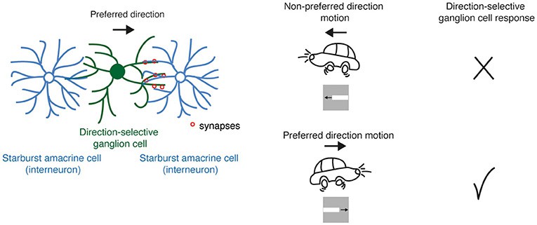 Denne ensidige forbindelse gør det muligt for retningsselektive ganglieceller at reagere, når bevægelsen er i én retning, men ikke når bevægelsen er i den anden retning. Det er sådan, retinale ganglieceller sender komplekse informationer til hjernen om, hvad øjet ser.