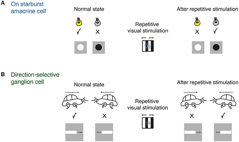 I mange år troede forskerne, at den visuelle cortex var meget forskellig fra nethinden, fordi cellerne i den visuelle cortex kan tilpasse sig og ændre deres respons alt efter, hvad dyret har set før. For eksempel har en retningsselektiv celle i synsbarken en bestemt foretrukken retning, men hvis den præsenteres for gentagen bevægelig stimulation (såsom hvide og sorte striber i bevægelse – se eksemplet i figur 3A), kan dens foretrukne retning ændres en smule og reorienteres. Man troede, at i modsætning til cortex kunne retningsselektive nethindeceller ikke ændre deres foretrukne retning. Det skyldes, at responser i nethinden menes at afhænge af forbindelserne mellem retningsselektive nethindeceller og starburst amakrinceller. Så det var meget overraskende at opdage, at celler i nethinden kan ændre deres respons [2].