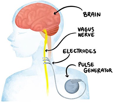 Nervus vagus er et bundt af neuroner, der forbinder hjernen med de indre organer for at kontrollere ufrivillige (automatiske) funktioner som hjerteslag og vejrtrækning (figur 1). I 1930’erne fandt forskere ud af, at når aktiviteten i vagusnerven steg, skete der også ændringer i hjernebølgerne, som kunne ses ved hjælp af en test kaldet EEG.. I 1980’erne fandt forskere ud af, at stimulering af vagusnerven kunne stoppe anfald hos hunde. Efter at yderligere undersøgelser viste, at stimulering af vagusnerven også kunne hjælpe mennesker, begyndte lægerne at bruge VNS til at behandle patienter med refraktær epilepsi – til at stoppe anfald eller forhindre dem i at blive værre. Selvom der er mange teorier, ved forskere og læger stadig ikke med sikkerhed, hvorfor VNS virker (figur 2).
