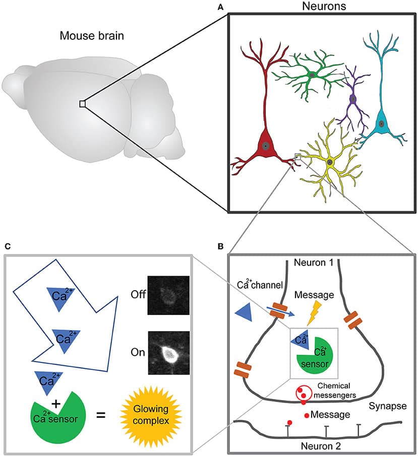 Neuroner kan videregive information ved hjælp af styrken og timingen af små elektriske strømme, der flyder gennem dem. For at skabe disse elektriske strømme bruger neuroner elektrisk ladede ioner, som er nogle af de mindste og mest basale byggesten i universet. En vigtig ion for neuroner er calcium, som kan strømme ind i neuronen gennem små åbninger kaldet ionkanaler. Når der strømmer nok calcium og andre ioner ind i neuronet, siger vi, at neuronet er “aktiveret” – ligesom når man tænder et lys. Aktiverede neuroner kan sende kemiske beskeder til andre neuroner gennem små kontakter mellem dem, kaldet synapser(figur 1). En kemisk besked kan fortælle den næste neuron, at den skal komme i gang med at sende flere beskeder videre, hurtigere! Det gør de andre neuroner meget ophidsede og producerer mere elektrisk aktivitet. En anden kemisk besked kan fortælle den samme neuron, at den skal stoppe med det, den er i gang med; det hæmmer den elektriske aktivitet, og neuronen bliver stille i et stykke tid. Al denne meddelelsesaktivitet foregår konstant i din hjerne – neuronerne er en meget aktiv flok. For at se, hvornår neuroner er aktiverede, bruger forskere små molekyler, der kan mærke calciumioner og derefter begynder at lyse – de kaldes calciumsensorer. (figur 1) [1]. En måde at få kalciumsensorer ind i en neuron er ved hjælp af genteknologi til at ændre DNA’et. Da en calciumsensor består af flere proteiner, kan forskerne tilføje tegningerne af disse proteiner til et dyrs DNA for at skabe mus, hvor calciumsensorer er til stede i specifikke typer af neuroner. Disse mus er ellers ligesom normale mus, bortset fra at calciumsensoren i hver neuron har et grønt fluorescerende protein, der kan lyse, når det binder til calciumioner, hvis der tilføres en smule energi ved at skinne laserlys på neuronerne. Det glødende kompleks absorberer først energien fra lyset og mister derefter hurtigt denne energi ved at udsende sit eget lys – deraf gløden. Når neuronet aktiveres, sker denne glødeproces meget hurtigt, inden for en brøkdel af et sekund, og den varer, indtil neuronet bliver inaktivt igen. Når neuronet er inaktivt, bliver det mørkt og er ikke længere synligt. Ved at se ændringerne i de lysende neuroner over tid, kan vi følge neuronernes kommunikation i deres netværk.