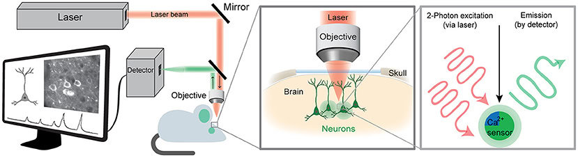 For direkte at observere de lysende neuroner i hjernen bruger vi et to-foton-mikroskop. Der er tre vigtige tekniske detaljer, som gør det muligt at se direkte ind i hjernen (figur 2). For det første har et to-foton-mikroskop en særlig laser, og dens laserstråle giver energi til calciumsensorerne, så de lyser, når de binder sig til calciumioner. Laserstrålen rettes af spejle og glaslinser mod den næstvigtigste del af mikroskopet: objektivet. Objektivet forstørrer de bittesmå neuroner, som hver især er omkring 10 μm store (0,01 mm). Forstørrelsen er normalt omkring 20 gange højere end med det blotte øje. Objektivet fokuserer laserstrålen ind i musehjernen, så kalciumsensoren kan lyse, og det opsamler også det udsendte (lysende) lys og leder det til den tredje vigtigste del af mikroskopet: detektoren. Detektoren kaldes et fotomultiplikatorrør, og den forstærker det udsendte lys fra neuronerne og omdanner det til et signal, ligesom et live-kamera. Når vi har lavet et lille glasvindue ind i musens hjerne, kan vi se en video af de aktiverede neuroner, der blinker til og fra via en tilsluttet computerskærm, og vi kan også optage dem. Vi kan analysere disse videoer for at få et signal for hver neuron over tid, så vi kan forstå neuronens aktivitetsmønster, og hvordan neuronerne kommunikerer i deres netværk.