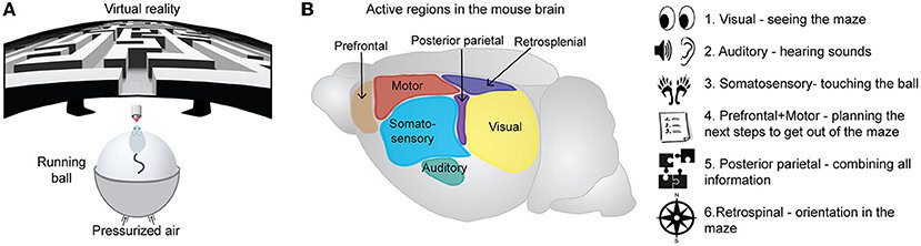 For at finde vej ud af labyrinten skal musene bruge bestemte områder i hjernen til at opfatte miljøet og navigere gennem det (figur 3B) [4]. Først aktiveres neuroner i det visuelle system, så de kan se labyrinten, farverne og kanterne på væggene. Det vigtigste hjerneområde til behandling af visuel information er den primære visuelle cortex. Hvis der er lyde i den virtuelle labyrint, er neuroner i den auditive cortex involveret. Fornemmelsen af at røre bolden, når musen løber gennem labyrinten, formidles af den somatosensoriske cortex. For det andet er de neuroner, der aktiveres til planlægning, kontrol og udførelse af dyrets faktiske bevægelser, placeret i den motoriske cortex og den præfrontale cortex. Al denne sensoriske og motoriske information skal også kombineres, og dette involverer neuroner i associationsregioner, såsom posterior-parietal cortex. Endelig, for at musen kan vide præcis, hvor den er i labyrinten, vil neuroner i regioner som retrosplenial cortex blive aktiveret [5]. Derfor arbejder sensoriske, motoriske og associative netværk alle sammen og sender løbende beskeder frem og tilbage til hinanden, så musen kan finde vej gennem labyrinten. Mennesker bruger også de samme generelle sensoriske, motoriske og associative hjernenetværk til at navigere sig gennem den virkelige verden hver dag.