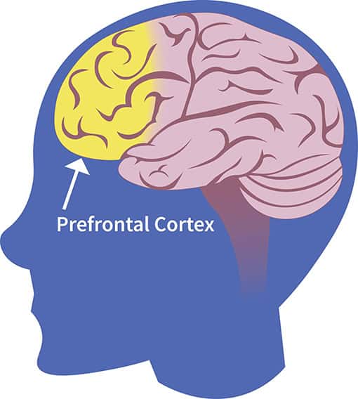 Teknologiske fremskridt gør det muligt for forskere at se nærmere på, hvordan hjernen ser ud og fungerer. Hjerneafbildningsteknikker, som magnetisk resonansafbildning (MRI), har vist, at ungdomsårene og den unge voksenalder er en tid med dramatiske forandringer, især i to store dele af hjernen. Den første del, kaldet det endocannabinoide system, hjælper med at udvikle og strømline forbindelserne mellem forskellige dele af hjernen [2]. Som du måske kan se af navnet, påvirkes dette system af cannabis. Den anden del af hjernen, der ændrer sig meget i denne periode, den præfrontale cortex, er hjernens kommandocentral eller “chef”, der er ansvarlig for funktioner som at træffe beslutninger, løse problemer og kontrollere vores egen adfærd (figur 1) [2]. Forskning fortæller os, at det endocannabinoide system og den præfrontale cortex stadig er under udvikling, indtil vi er midt i 20’erne. Indtil denne alder er disse dele af hjernen særligt følsomme over for virkningerne af kemikalier som alkohol, cannabis og andre stoffer [2].