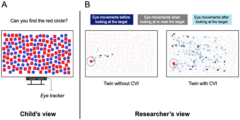 Når forældre eller lærere mener, at et barn muligvis har CVI, mødes de med et specielt team af klinikere, der omfatter en øjenspecialist, der undersøger øjenfunktionerne, og en neuropsykolog, der undersøger, hvordan hjerneskader kan ændre den måde, et barn lærer, husker eller ser verden på. For at finde ud af, hvordan børn søger efter ting, kan neuropsykologer bruge visuelle søgeopgaver (se figur 1 for to eksempler). Barnet får et papir fyldt med billeder af objekter eller former og bliver bedt om at finde et bestemt objekt, f.eks. en rød cirkel. Dette objekt kaldes målet. De andre former kaldes distraktorer – f.eks. de blå cirkler og de røde firkanter. Barnet skal enten så hurtigt som muligt sige, om målet er til stede (verbal respons), eller det skal strege målene over med en blyant (motorisk respons). Bagefter kontrollerer neuropsykologen, hvor mange mål barnet har fundet, og hvor hurtigt barnet har fundet dem.