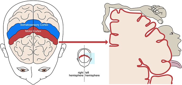 Den somatosensoriske cortex (figur 1) er også meget vigtig for bevægelse. “Soma” betyder krop, og “sensorisk” henviser til fornemmelser, der hjælper os med at forstå og interagere med verden omkring os, som berøring, temperatur og smerte. For eksempel kan vi mærke kold sne på vores hænder, når vi rører ved den, eller føle smerte, hvis vi falder og skraber vores knæ. Og hvis vi lukker øjnene og bevæger kroppen, ved vi stadig, hvor vores arme og ben er, selv om vi ikke kan se dem. Disse fornemmelser kommer fra sensoriske receptorer.Det er en del af hjernen, som er placeret i huden og musklerne, og som måler, hvad vi føler, og sender denne information til hjernen. Så den somatosensoriske cortex er den del af hjernen, der behandler og fortolker fornemmelser fra kroppen. Den motoriske og den somatosensoriske hjernebark er tæt forbundet og kommunikerer konstant. Deres kommunikation skal være meget effektiv, fordi enhver bevægelse forårsager somatosensoriske fornemmelser, og disse fornemmelser påvirker, hvordan vi bevæger os næste gang. Den somatosensoriske cortex er organiseret på samme måde som den motoriske cortex – specifikke steder behandler de fornemmelser, der kommer fra bestemte kropsdele.