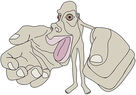 For at kontrollere kroppen skal hjernen fortælle specifikke kropsdele, at de skal bevæge sig. Til at hjælpe med dette er der et “kort” over kroppen i den motoriske cortex. Kropsdele, der er knyttet til hinanden, som hånd og arm, er placeret tæt på hinanden i dette hjernekort. Men denne effektive organisering slutter ikke her. Bruger du alle dine kropsdele lige meget, eller er nogle dele i stand til at udføre mere præcise handlinger? Tænk for eksempel på dine hænder og fødder. Kan du tråde en nål med dine tæer? Nogle kropsdele har sværere opgaver, så de kræver flere ressourcer fra hjernen. Hjernen tildeler større områder til opgaver, der er mere krævende. Derfor er det område i hjernen, der svarer til hænderne, større end det område, der svarer til fødderne. Kroppens kort i hjernen matcher ikke den fysiske størrelse af hver kropsdel, men matcher i stedet, hvor vigtigt og præcist hver kropsdels job er. Hvis vi tegnede hver kropsdel med en størrelse, der var proportional med den plads, den er tildelt i hjernen, ville det resultere i et mærkeligt billede af en krop med meget store hænder og meget små ben. Denne figur kaldes en homunculus[1], som bogstaveligt talt betyder “lille person” (figur 2).