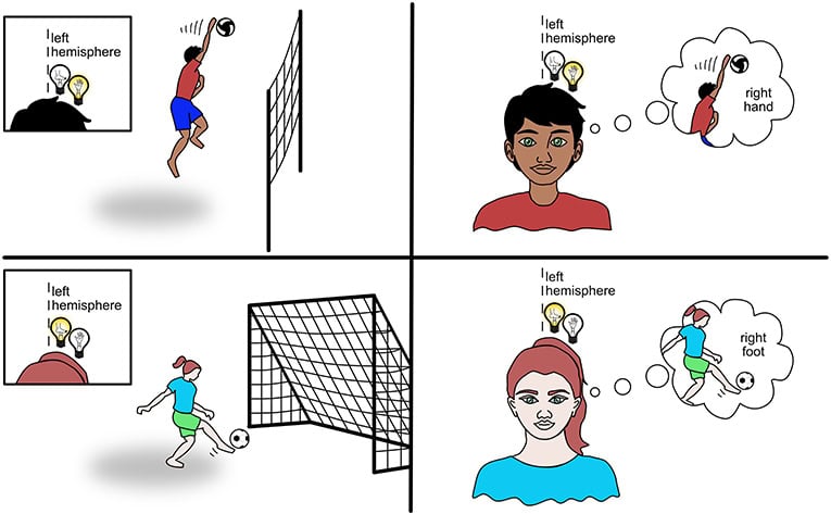 Vi nævnte, at homunculus har meget store hænder. Kan du forestille dig en anden kropsdel, der vil være meget stor i homunculus? Tænk på, hvor vigtig din mund er, når du taler og spiser. Bare ved at forestille dig din mund, bliver mundområdet i din hjerne aktiveret – du kan aktivere din motoriske cortex bare ved at tænke på at bevæge dig! Hvis du f.eks. leger med en bold og rører den med hænderne, aktiveres håndområderne i din hjerne. Hvis du senere tænker på at røre bolden, vil de samme hjerneområder blive aktiveret, selv om du ikke rører bolden (figur 3). Når du bare forestiller dig bevægelsen, bliver andre dele af hjernen involveret for at forhindre dine muskler i at bevæge sig.