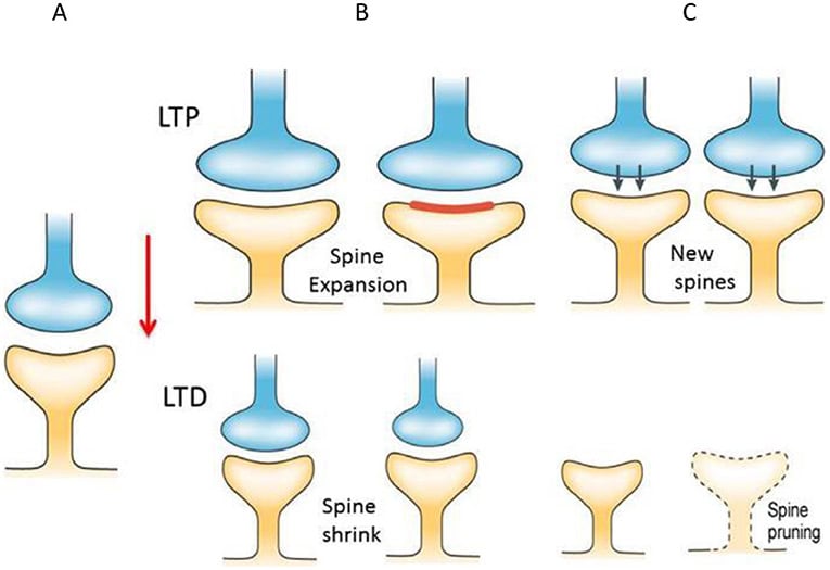 Ideen om, at dendritiske pigge er forbundet med læring og hukommelse, er blevet testet i en række eksperimenter, hvor man har sporet ændringer i strukturen af dendritiske pigge i hjernen på laboratorierotter og i hjerneskiver. I disse eksperimenter kiggede forskerne på piggene før og efter eksponering for elektrisk stimulation. Den elektriske stimulering forårsagede et fænomen, der kaldes long-term potentiation (LTP), som udtrykkes som en stigning i neuronets respons på elektrisk stimulation, og som genereres langs det dendritiske træ (se figur 1). I løbet af de sidste 50 år er LTP blevet undersøgt i tusindvis af eksperimenter, hvor man har kigget på hele hjernen, hjerneskiver og hjerneceller dyrket i laboratoriet. I en nøddeskal viste disse eksperimenter, at hjernen bruger en LTP-lignende mekanisme til at generere hukommelse, og hvis denne mekanisme deaktiveres, forsvinder hukommelsen eller kan ikke erhverves. Vores fund af LTP i dendritiske pigge efter elektrisk stimulation fortæller os således, at pigge spiller en vigtig rolle i synaptisk plasticitet. På samme måde kan en reduktion i synaptisk aktivitet føre til en proces med Long-Term Depression (LTD), hvorved dendritiske pigge, der ikke er aktiveret, kan skrumpe og miste deres synaptiske partner (f.eks. figur 2, nederste linje).