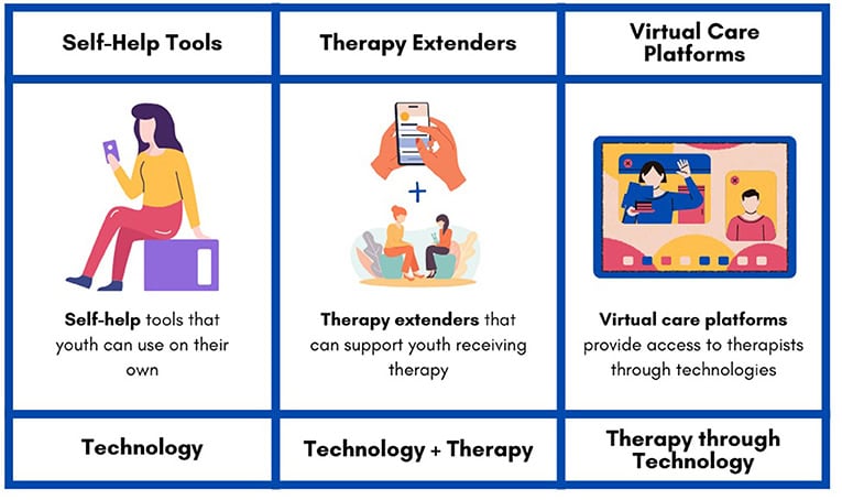 Redskaber kaldet terapiforlængere kan understøtte de færdigheder og strategier, der læres i terapien, og de kan tilbyde unge mennesker aflastning, når en terapeut ikke er tilgængelig – f.eks. efter arbejdstid eller sent om aftenen. Disse værktøjer giver terapeuter flere måder at undervise i mentale sundhedsfærdigheder på eller måder, hvorpå deres unge patienter kan tage lektionerne og færdighederne med hjem. Mange terapiforlængere er baseret på en type terapi, der hedder kognitiv adfærdsterapi det er meningen, at folk skal få det bedre ved at ændre, hvordan de tænker, og hvad de gør. Terapiforlængere kan forkorte den tid, der er nødvendig til terapi, og gøre den tid mere nyttig. Et eksempel kunne være en app til kognitiv adfærdsterapi med interaktive øvelser og en dagbog til tanker, følelser og adfærd, som patienten kan tage med til sessionerne og diskutere.