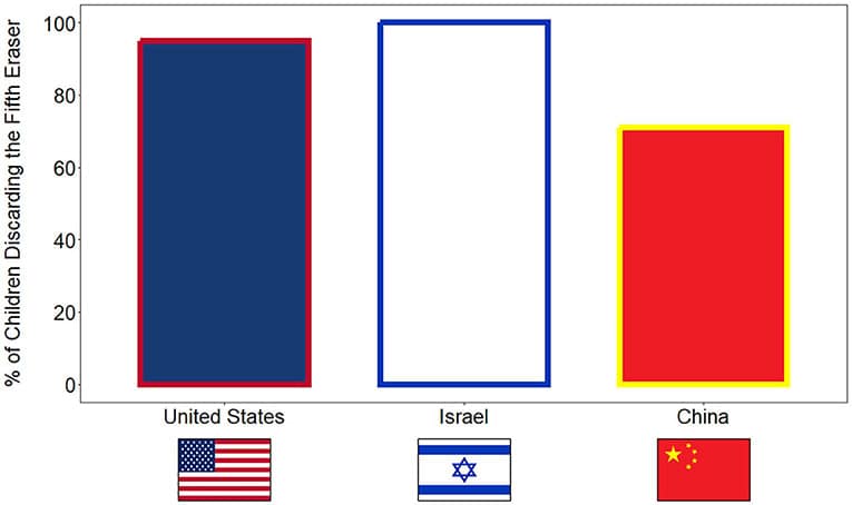 Resultaterne af undersøgelsen var klare: I USA og Israel valgte mere end 90% af børnene at smide det femte viskelæder i skraldespanden og foretrak dermed affald frem for ulighed. I Kina valgte de fleste børn også at smide det femte viskelæder ud, men i mindre grad end i USA og Israel (ca. 70%, se figur 2). Hvorfor kasserede børnene i Kina det femte viskelæder sjældnere end de andre børn? Vores hypotese var, at de kinesiske børn, sammenlignet med børnene i USA og Israel, fandt viskelæderne mere værdifulde, og derfor var de mindre villige til at smide dem væk. Da vi bad børn i de tre lande om at dele ressourcer med forskellige omkostninger – tuscher, smartphones eller penge – jo dyrere ressourcen var, jo mindre tilbøjelige var børnene til at smide genstanden væk. Alligevel valgte omkring halvdelen af børnene stadig at smide smartphones og penge i skraldespanden! Det vil sige, at børn har en tendens til at spilde ressourcer for at undgå ulighed, men de spilder mindre, hvis de føler, at ressourcerne er mere værdifulde.