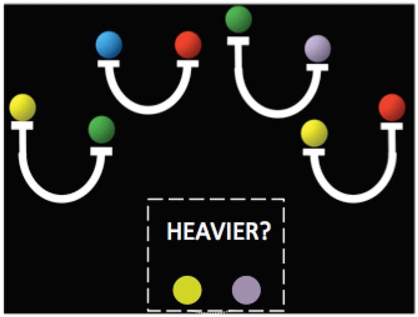 Se på puslespillet i figur 1, som viser vægten af forskellige farvede bolde. Kan du se, om den gule eller den lilla kugle er tungest? Kuglerne placeres på en hvid balance for at se, hvilken der er tungest. Den grønne kugle er tungere end den gule kugle, og den lilla kugle er tungere end den grønne kugle. Så den lilla kugle må være tungere end den gule!