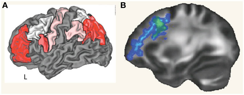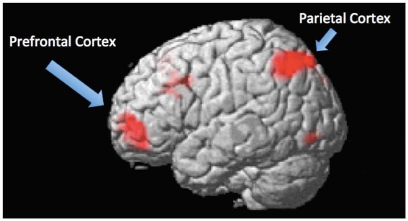 To hjerneområder, der er særligt aktive, når mennesker løser vanskelige problemer, er vist i figur 2: præfrontal cortex, foran i hjernen, og parietal cortex, bagved [3]. Når du løser problemet med de farvede bolde ovenfor, hjælper parietal cortex dig først med at forstå, at billedet ovenfor fortæller dig vægten af de forskellige farvede bolde, så du kan sammenligne dem. Derefter hjælper præfrontal cortex dig med at kombinere relationerne mellem kuglerne. Din præfrontale cortex regner ud, at hvis den lilla bold er tungere end den grønne, og den grønne er tungere end den gule, så må den lilla bold også være tungere end den gule. Det er i hvert fald, hvad vi tror, vi har lært af vores fMRI-forskning om, hvordan præfrontale og parietale regioner hjælper os med at ræsonnere [4].