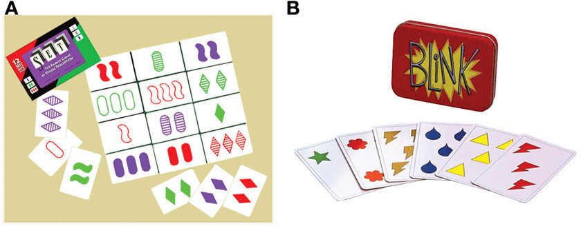 Børnene blev delt op i to grupper. Den ene gruppe spillede spil, som vi mente ville træne deres ræsonnementsevner, såsom spillet SET vist i figur 3A. Den anden gruppe børn spillede spil, der kræver hurtig beslutningstagning, som spillet Blink vist i figur 3B. Vi sammenlignede ræsonnementstræningsprogrammet med dette hastighedstræningsprogram, fordi vi ønskede at se, om det at spille forskellige slags spil ville styrke forskellige slags færdigheder.