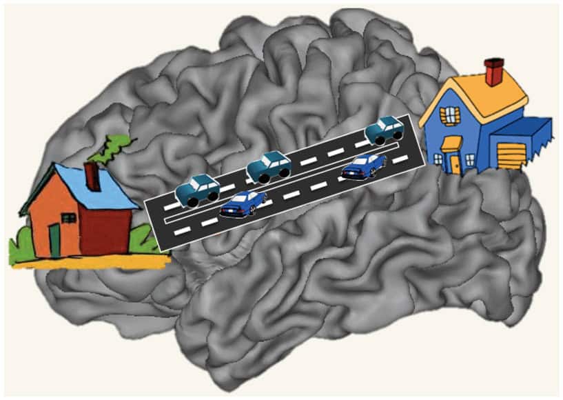 Mens vores forsøgsdeltagere var i MR-scanneren, brugte vi også diffusion tensor imaging (DTI), en MR-metode, der hjælper os med at se den hvide substans i hjernen. Den hvide substans er som veje og motorveje mellem neuroner, der hjælper forskellige områder af hjernen med at tale sammen. Vand bevæger sig gennem hjernen langs disse veje i den hvide substans, og vi kan måle, hvilke veje vandet tager gennem hjernen med DTI. Vi ønskede at teste, om det at øve ræsonnementsevner i 3 måneder kunne føre til ændringer i DTI-målinger, hvilket ville antyde ændringer i den hvide substans. Som vist i figur 4B fandt vi DTI-ændringer i præfrontal og parietal hvid substans i forsøgsgruppen sammenlignet med kontrolgruppen [8]. Vi tror, at den hvide substans, der forbinder disse vigtige ræsonneringsområder, blev mindre som en grusvej og mere som en stor motorvej med flere biler og højere hastigheder.