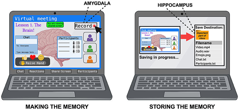 Amygdala er en lille, men indflydelsesrig del af et større netværk af hjerneområder, der er involveret i læring og hukommelse. Når amygdala bliver aktiveret, fortæller den det til en nærliggende del af hjernen, hippocampus Du kan også notere dig de mange hjerneområder, der blev aktiveret af oplevelsen. Alle disse dele af hukommelsen kan gemmes og sættes sammen igen senere, når du husker begivenheden. Det er som at optage et lille øjebliksbillede af en virtuel time i skolen (figur 1). Det virtuelle møde er i gang, og din lærer begynder at tale om noget virkelig vigtigt, f.eks. en lektion om hjernen, som du ved, du gerne vil huske senere. Du trykker på den store røde “optag”-knap på skærmen. Mens mødet fortsætter, kan du se de andre børn i din klasse i deres videobobler på siden af din skærm. Du kan også se eleverne skrive spørgsmål i chatboksen, mens din lærer taler. Af og til vil en elev bruge tommelfinger-op-reaktionsemojien for at fortælle læreren, at de forstår, hvad der foregår. Du stopper optagelsen efter et par minutter, og den bliver gemt i en mappe på din computer, som indeholder alle dele af optagelsen. Videoen, lyden, chattråden, emojierne og listen over deltagere bliver alle gemt som individuelle filer i denne mappe. Det svarer til den måde, hippocampus gemmer hver del af en oplevelse på, så du kan huske den senere. Man kan tænke på amygdala som vigtig for at fortælle hjernen, hvornår den skal gemme en oplevelse, og hippocampus som den del, der er vigtig for at vide, hvor hukommelsen er gemt, og hvordan man syr disse detaljer sammen igen, når man genkalder sig hukommelsen senere. Uden denne “gemme”-funktion i amygdala ville dit virtuelle klassemøde gå tabt eller blive glemt. Men når du trykker på “optag”-knappen, fortæller du din hippocampus og resten af din hjerne, at de skal lave en hukommelse for de specifikke dele af den klasseoplevelse.
