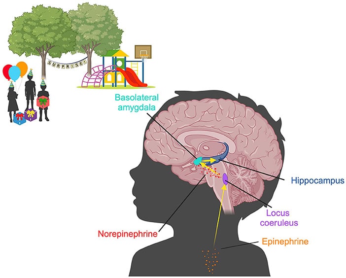 Den mandelformede amygdala er et hjerneområde dybt bag ørerne, nær midten af hjernen. En del af amygdala, kaldet den basolaterale amygdala, bliver aktiveret under følelsesmæssige oplevelser. Når der sker noget spændende, som f.eks. at blive overrasket af sine venner til sin fødselsdag, aktiveres binyrer oven på dine nyrer frigiver et stof, der hedder epinephrine også kendt som adrenalin (figur 2). Adrenalinet får derefter en anden del af hjernen, locus coeruleus, til at frigive et andet stof, norepinephrine direkte ind i din basolaterale amygdala, hvilket får den til at blive aktiveret [3]. Aktiveringen af din amygdala ved dette rush af noradrenalin klikker “gem” på denne oplevelse, hvilket gør det mere sandsynligt, at du vil huske denne fødselsdagsfest i lang tid.