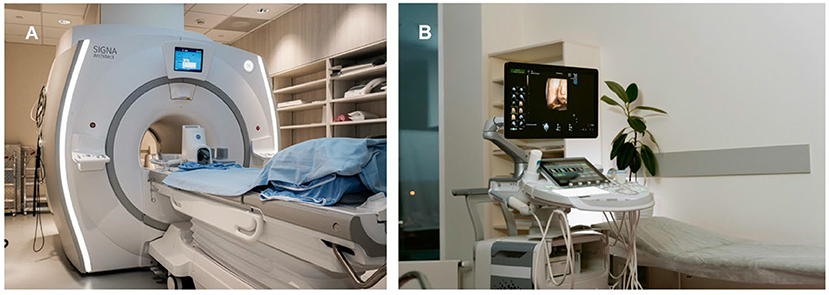 En anden god mulighed, som læger har for at se blødt væv som muskler, sener og ledbånd, er ultralyd (figur 2B). Interessant nok kan den samme ultralydsmaskine, der bruges til at se et barn inde i en gravid mor, også bruges til at diagnosticere problemer med bevægeapparatet. Ultralyd fungerer ved at sende lydbølger gennem en lille enhed kaldet en. Bølgerne passerer derefter gennem kroppen og reflekteres af forskellige væv for at give et realtidsbillede på skærmen. I modsætning til røntgenstråler eller MR-scanning kan ultralyd vise bevægelser i realtid. Dette gør det særligt nyttigt til at styre injektioner af medicin i leddene for at hjælpe med slidgigt og til at observere bevægelser i muskler, sener og led. Ultralyd er også bærbart, hurtigt og bruger ikke stråling. Men ligesom alt andet har ultralyd nogle begrænsninger. Et af de største problemer med ultralyd er, at det ikke kan se særlig godt inde i leddene, fordi lydbølgerne reflekteres af knoglerne i stedet for at passere igennem dem. Desuden afhænger billedernes nøjagtighed af den persons færdigheder, der bruger det [3].