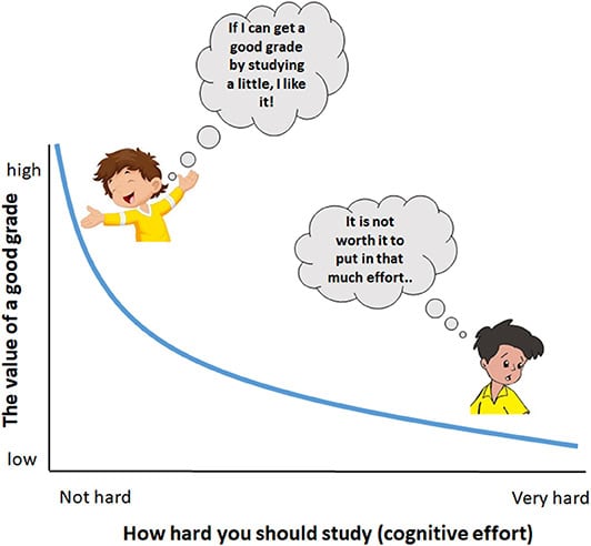 I figur 1 kan du se, at hvis du skal læse meget hårdt for at få en god karakter, falder værdien af at få den karakter. Det betyder, at den kognitive indsats sandsynligvis også reducerer eller diskonterer værdien af en god karakter. Det er det, forskerne kalder effort discounting.