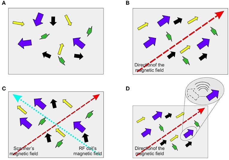 MR-scannere fungerer ved at tage billeder af hjernen et tyndt lag ad gangen. Billederne stables derefter som pandekager for at skabe et fuldstændigt billede af det område, der undersøges. Hvordan er det muligt, spørger du måske? Menneskekroppen består af milliarder af molekyler, herunder vandmolekyler, som kan detekteres af MRI-maskinen. Atomer i alle molekyler, inklusive vandmolekyler (H2 O), indeholder protoner [1]. Protoner er som små magneter [1]. I fravær af et meget stærkt magnetfelt (dvs. når vi er uden for MR-scanneren), er protonerne i vores krop orienteret i tilfældige retninger (figur 2A). Når vi ligger inde i scanneren, tvinger dens stærke magnetfelt, som normalt er titusind gange stærkere end jordens magnetfelt, disse protoner til at rette sig ind efter feltet, selvom vi slet ikke kan mærke det (figur 2B). Gradientspolen (se figur 1) hjælper scanneroperatørerne med at bestemme præcis, hvor vores krop befinder sig inde i scanneren.
