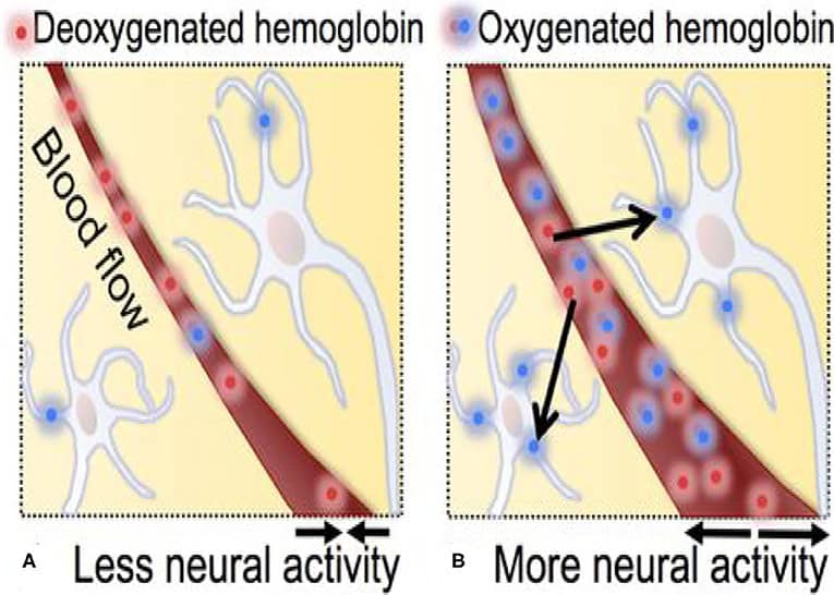 Neural aktivitet kræver energi. Ligesom andre celler i kroppen genererer neuroner energi ved at bruge ilt til at nedbryde sukker. Når den neurale aktivitet øges i en del af hjernen, bruges der mere energi. For at genopbygge denne energi transporteres der mere iltbærende blod til det pågældende hjerneområde. Blodet transporterer ilt ved hjælp af et molekyle, der hedder hæmoglobin. Hæmoglobin indeholder jern, hvilket giver det magnetiske egenskaber, som en lille jernfil. Afhængigt af om hæmoglobinet transporterer ilt eller ej (dvs. om det er iltet eller deoxygeneret), har det lidt forskellige magnetiske egenskaber. Således resulterer større neural aktivitet i en større strøm af iltet blod (figur 3), så hjerneområder, der er mere aktive, er lidt mere magnetiske. Det resulterer i lidt forskellige mønstre af elektromagnetiske bølger.