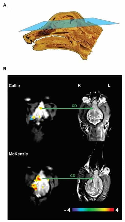 I løbet af de sidste ca. tre årtier har forskere brugt BOLD MR-billeddannelse til at begynde at besvare Joys spørgsmål om, hvad der foregår inde i folks hoveder. Hvor stor magt fMRI har til at kigge ind i de ellers uigennemtrængelige dybder af hjernens funktion, både hos mennesker og dyr, illustreres smukt af Dr. Gregory Berns og hans kollegers arbejde. De sammenlignede BOLD-aktiviteten i hjernen hos hunde som reaktion på to forskellige håndsignaler fra deres førere: et, der fortalte hundene, at de ville få en velsmagende madbelønning, og et andet, der fortalte dem, at de ikke ville få en belønning (figur 4A).