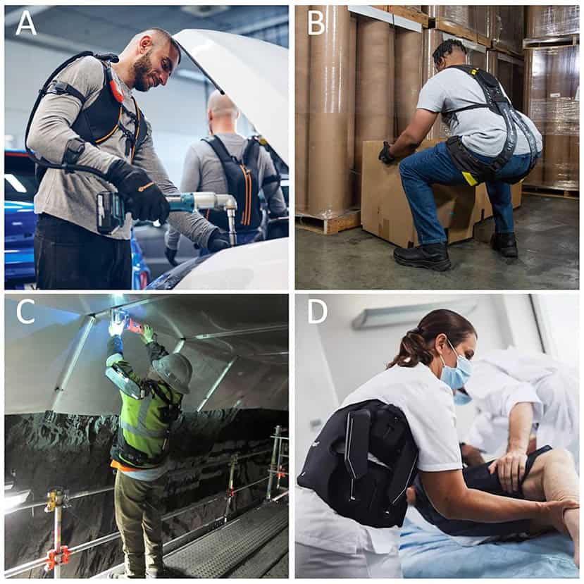 Work exos (også kaldet occupational exos) er bærbare enheder, der gør fysiske job lettere, eller som hjælper med at forbedre en arbejdstagers fysiske præstation eller sikkerhed (figur 1). Det er vigtigt, fordi arbejdsskader på grund af fysisk overanstrengelse rammer hundredtusinder af mennesker og koster over 12 milliarder dollars (USD) hvert år alene i USA. Exos kan hjælpe folk med at løfte tunge ting med mindre risiko for skader [1], opretholde en vanskelig kropsholdning med mindre muskelbelastning eller udføre en gentagen opgave med højere kvalitet og mindre træthed. Exos kan være lavet af metal, plast, elastik eller stof. Traditionelt er exos stive (deraf betegnelsen exoskelet), men moderne exos kan også være bløde, f.eks. tekstilbaserede exos (kaldet exosuits).