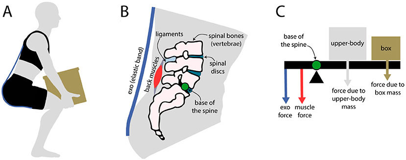 Der findes to hovedtyper af exos: elastiske exos (også kaldet passive) og aktive exos (også kaldet powered). Elastiske exos har ikke motorer eller elektroniske dele. I stedet bruger de mekaniske elementer som fjedre og håndtag til at støtte kroppen, hjælpe med bevægelse eller forbedre den fysiske præstation. Når en person iført en exo bøjer sig ned for at samle en genstand op, lagres der f.eks. potentiel elastisk energi i en fjeder (f.eks. fordi et elastisk bånd strækkes, figur 2), hvilket reducerer kraften på rygmusklerne og ledbåndene. Når personen begynder at løfte, returnerer fjederen sin elastiske energi, hvilket giver et løft og gør genstanden lettere at løfte. På grund af det fysiske princip om løftestangseffekt reducerer exo’en også den samlede trykkraft på rygknogler (kaldet ryghvirvler) og diskusskiver. Elastiske exos er generelt lettere, billigere og enklere end aktive exos. De kræver ikke batterier eller opladning, hvilket gør dem meget pålidelige og ofte lettere at bruge. Elastiske exos kan dog kun levere visse typer assistanceprofiler og har generelt ikke de ekstra sensorfunktioner, som aktive exos tilbyder.