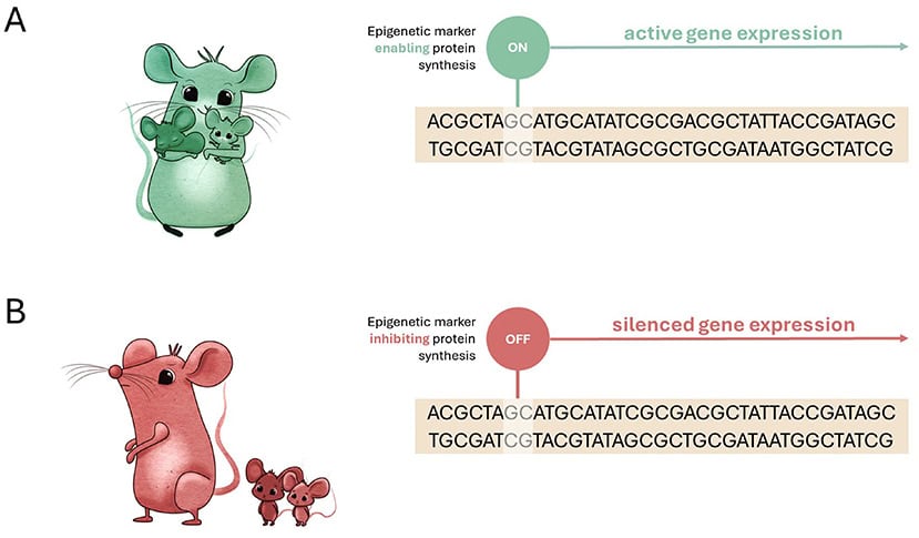 De opdagede, at hvalpene fra de meget kærlige rottemødre, som fik masser af omsorg og kærlig berøring, havde et specifikt sæt epigenetiske markører på deres DNA. Især gener relateret til stresshåndtering havde epigenetiske markører, der hjalp dem med at producere flere proteiner. Hos rotter, hvis mødre var mere reserverede, havde de samme gener epigenetiske markører, der førte til produktion af færre af disse proteiner (figur 1). Dette resultat indikerer, at rotter, der har haft omsorgsfulde mødre, kan have lettere ved at håndtere stressende situationer, som de oplever i deres eget liv, mens rotter, der er opvokset hos reserverede mødre, kan have sværere ved at håndtere eller komme sig over stress. Alt i alt viste disse resultater, at den måde, en rottemor tager sig af sine unger på, kan efterlade et varigt indtryk på deres DNA. Det er, som om hendes kærlighed og ømhed formede den måde, hendes unger kunne reagere på stressede situationer og håndtere livets op- og nedture. Men gælder det også for mennesker?