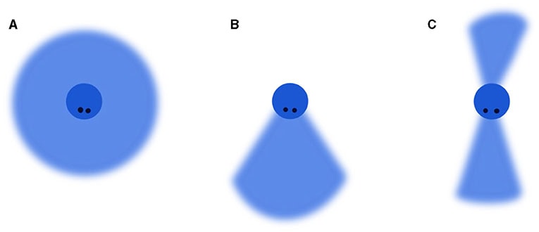 Blake har en cirkel omkring sig. Vi kalder dette område for interaktionsregionen og det er en slags Blakes personlige boble! Når en anden kommer ind i boblen, reagerer Blake, ligesom du ville reagere, hvis nogen stod for tæt på. Denne region behøver heller ikke at være en cirkel. Der er mange forskellige former, som kan give mening i forskellige situationer. I figur 2 kan du se nogle andre almindelige typer af interaktionsområder. Men indtil videre holder vi os til en cirkulær interaktionsregion.