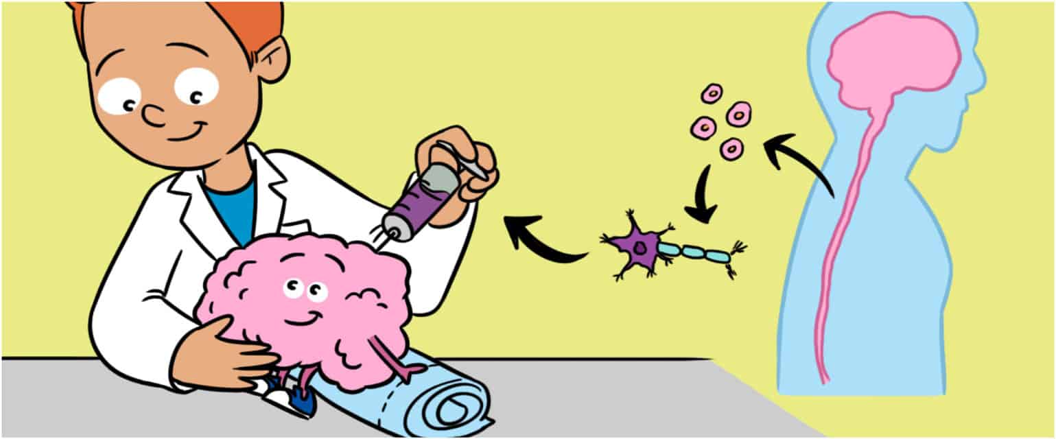 Neuroner er celler i hjernen og rygmarven, som er specialiserede i at kommunikere information i kroppen. Neuroner er vigtige for mange ting, herunder at bevæge sig, trække vejret, tænke og føle smerte. Hvis disse celler bliver skadet, f.eks. på grund af en ulykke, kan kroppen ikke længere udføre nogle af disse vigtige funktioner. Som følge heraf kan en person blive handicappet på en eller anden måde. For at hjælpe patienter med skader på hjernen eller rygmarven kan forskere og læger måske erstatte beskadigede neuroner ved at transplantere nye celler ind i den skadede person. Ved at bruge nye celler til at erstatte de neuroner, der er gået tabt på grund af skaden, er det muligt, at patienterne kan genvinde nogle af deres tabte evner, f.eks. at bevæge sig. Forskerne mener, at stamceller er den ideelle celletype at transplantere ind i skadede patienter, fordi stamceller kan formere sig og ændre sig til de forskellige celletyper, der er nødvendige for at reparere skaden. De stamceller, som forskerne transplanterer, kan fremstilles i laboratoriet ud fra hudceller og blodceller. Både hud- og blodceller kan udtages ved hjælp af en nål. I øjeblikket bruges stamceller fra patienter med hjernesygdomme som Alzheimers sygdom til at studere disse sygdomme i laboratoriet, så der kan udvikles celleerstatningsterapier.