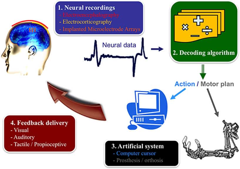 På den intrakortikale optagelsesfront (dvs. ved hjælp af elektrodearrays til at registrere aktiviteten af enkelte neuroner) har de seneste fremskridt givet et “proof of concept”, der viser den teoretiske mulighed for at opbygge funktionelle BMI-systemer i den virkelige verden. Faktisk har det sidste årti budt på imponerende demonstrationer af neural kontrol af proteser hos gnavere, ikke-menneskelige primater og mennesker, der deltager i kliniske fase I-forsøg. Disse fremskridt vil accelerere kraftigt i løbet af de næste 5-10 år og forventes at føre til en lang række klinisk anvendelige løsninger til forskellige neurologiske tilstande.