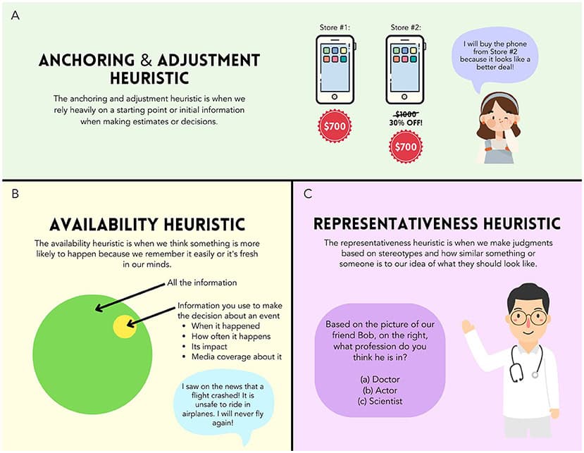 Når vi løser problemer under tidspres, eller når der er stor usikkerhed, har vi en tendens til ikke at bruge strengt logiske ræsonnementer. I stedet har vi en tendens til at ty til en eller flere mentale genveje, også kaldet heuristikker, for at løse problemet. Fordelen ved at bruge heuristikker er, at de giver os mulighed for at træffe beslutninger hurtigt, hvorimod det kan være udmattende og tidskrævende at gennemgå alle trinene i et strengt logisk ræsonnement. Ulempen er, at heuristiske ræsonnementer kan føre til specifikke typer af fejl i vores beslutningstagning. Undersøgelser har vist, at både eksperter og ikke-eksperter bruger heuristik til at løse problemer inden for alle områder af livet, herunder medicin, erhvervsliv, politik, retshåndhævelse og endda inden for videnskab. Forskere har også identificeret flere forskellige heuristikker. I denne artikel på vil vi fokusere på tre af de mest undersøgte heuristikker og vise, hvordan de kan påvirke beslutninger i det virkelige liv og endda beslutninger om liv eller død.