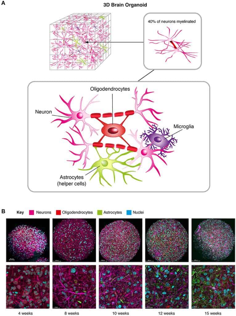 Jo mere hjerneorganoider ligner menneskehjerner, jo mere sandsynligt er det, at de er i stand til at udføre menneskelignende hjerneaktiviteter, som at lære og huske. På trods af deres lille størrelse har hjerneorganoider nogle strukturelle og funktionelle ligheder med menneskehjerner. For eksempel indeholder den menneskelige hjerne flere typer celler: (nerveceller), som er ansvarlige for at sende signaler i hjernen og mellem hjernen og kroppen; oligodendrocytter (oh⋅luh⋅go⋅den⋅druh⋅sites), som dækker dele af neuroner med et materiale kaldet myelin; og mikroglia og astrocytter, som understøtter neuronernes sundhed. Hjerneorganoidkulturer har vist sig at understøtte væksten af neuroner og disse andre celletyper, som alle er nødvendige for indlæring (figur 1A). Derudover er omkring 40% af neuronerne i hjerneorganoider dækket af myelin, mens omkring 50% af neuronerne i den sunde menneskehjerne er myeliniserede – så hjerneorganoider er ikke langt væk! Myelin fungerer som plastikken på ydersiden af en kobbertråd – det isolerer tråden, og til forskel fra isoleringen på en ledning får det også signalet til at bevæge sig 100 gange hurtigere. Med hensyn til funktion viser hjerneorganoider elektrisk aktivitet og reagerer på elektrisk stimulering på måder, der ligner celler i hjernen hos for tidligt fødte menneskebørn.
