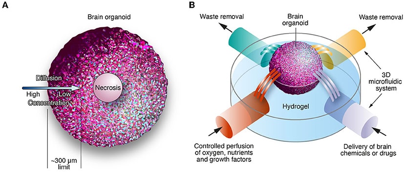 Da de hjerneorganoider, der dyrkes nu, er så små, at de knap nok er synlige (på størrelse med en stueflues øje), er det et vigtigt første skridt mod at udvikle organoid intelligens at lære, hvordan man gør dem større og mere hjerneagtige. Når hjernecellekulturer er små eller todimensionelle (flade), kan cellerne få ilt og næringsstoffer og komme af med affaldsstoffer direkte gennem den væske, de vokser i, via diffusion, som er den naturlige bevægelse af molekyler fra områder med høj koncentration til områder med lav koncentration. Men diffusion er ikke effektiv nok til at understøtte større 3D-kulturer [4]. Den menneskelige hjerne har blodkar, der udfører denne transportfunktion – halvdelen af hjernens vægt i blod strømmer gennem hjernen hvert minut. Noget lignende vil være nødvendigt for at dyrke større hjerneorganoider for at forhindre, at deres centre dør – en proces, der kaldes nekrose. Forskere udvikler mikrofluidiske systemer, der kan fungere som små blodkar (figur 2). Mikrofluidiske systemer vil ikke kun fjerne affaldsstoffer og give ilt og næringsstoffer til hjerneorganoiderne, men de vil også give forskerne mulighed for at administrere og teste virkningerne af andre kemikalier, der er involveret i den menneskelige hjernes normale funktion, eller mulige lægemidler til behandling af hjernesygdomme.