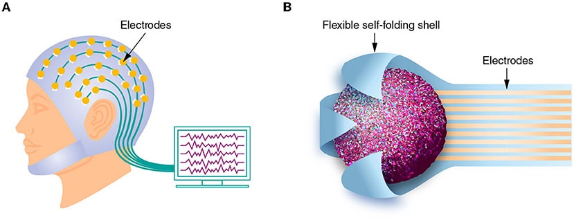 For at udvikle OI skal hjerneorganoider fungere på samme måde som menneskehjerner – og forskerne skal have en måde at måle denne aktivitet på. Læger måler den elektriske aktivitet i rigtige menneskehjerner med en teknik, der kaldes elektroencefalografi (uh⋅lek⋅trow⋅uhn⋅seh⋅fuh⋅laa⋅gruh⋅fee; EEG), hvor elektroder placeres på patientens hovedbund. Denne teknik inspirerede os til at skabe en lille version, kaldet 3D microelectrode array (MEA), der både kan stimulere og måle den elektriske aktivitet i hjerneorganoider. MEA’erne er som fleksible skaller, der kan foldes rundt om hjerneorganoiderne, så man kan måle den elektriske aktivitet på hele overfladen af 3D-organoiden (figur 3). Forskerne arbejder også på at udvikle særlige prober, som hjerneorganoiderne kan vokse helt rundt om, hvilket kan give klarere signaler og give forskerne adgang til indersiden af en organoid.