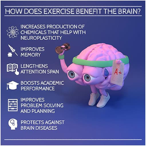 Nu ved du, at motion ikke kun kan gavne din krop, men også din hjerne. Fysisk aktivitet fremmer en sund hjerne ved at forstærke processen med neuroplasticitet. Faktisk kan fysisk aktivitet styrke de eksisterende forbindelser mellem neuroner og samtidig hjælpe med at tilføje nye forbindelser mellem dem. På den måde kan motion forbedre hukommelsen og de akademiske præstationer; med den ekstra bonus, at det bremser neurodegenerative sygdomme og hjælper hjernen til at hele bedre efter skader. Så næste gang du ikke har lyst til at gå til gymnastik eller beslutter dig for at springe træningen over, så prøv at huske på, at gode ting kommer til dem, der sveder!