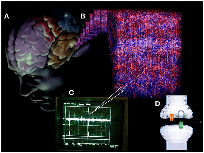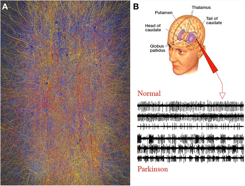 For det andet ønsker vi at ændre den måde, vi forsker i psykiske sygdomme på; dette er den kliniske del af HBP. Hjernen er en vidunderlig, kreativ og følelsesmæssig maskine, men den er skrøbelig – især (men ikke kun) i alderdommen, hvor ødelæggende sygdomme som Alzheimers, Parkinsons, depression og søvnforstyrrelser har tendens til at dukke op. Den centrale påstand i HBP er, at hvis vi ønsker at reparere hjernen, skal vi have en nøjagtig computermodel af de regioner, der er ansvarlige for en bestemt sygdom. Hvis en computermodel kan generere aktivitet, der efterligner aktiviteten i en syg hjerne (f.eks. under Parkinsons sygdom, se figur 3B), vil vi nemlig finde ud af, hvad der genererede denne forkerte aktivitet i computermodellen, og da vi selv har opbygget det modellerede netværk trin for trin, bør vi være i stand til at forstå, hvad der går galt og fremkalder denne sygdomslignende netværksaktivitet i computeren. En sådan videnskabelig interaktion med den digitale kopi af det syge hjerneområde vil give systematiske måder at reparere den “syge computer” på og dermed målrette de specifikke elementer, der er ansvarlige for den tilsvarende sygdom (f.eks. visse synapser/forbindelser, der fungerer dårligt, eller specifikke neurontyper, der fejlagtigt udsender elektriske signaler).