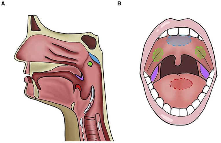 Når folk taler om mandler, taler de normalt om de to strukturer bagerst i halsen, kaldet palatin tonsils. Du kan se dem, når du åbner munden på vid gab og ser dig i spejlet. De sidder på hver side af drøblen, som er den struktur, der hænger ned i midten. Mandlerne er lavet af lymfatisk væv som består af hvide blodlegemer, der bekæmper bakterier for at holde os sunde [1]. Vidste du, at mennesker har to andre mandler? Den lingual tonsil findes bagerst på tungen, og polypperne sidder lidt højere oppe i halsen, hvor vi ikke kan se dem. Alle fire mandler danner et ringlignende skjold, som kaldes Waldeyers ring (Figur 1) [2]. Mandlerne er vigtige, da de er en del af immunsystemet. Det er vores første forsvarslinje mod bakterier, som vi kan indånde eller indtage.