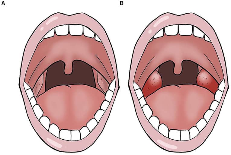 Nogle gange, når bakterier overvælder immunforsvaret, kan ganetonsillerne blive inficeret. Dette kaldes tonsillitis (Figur 2). Disse bakterier kan være vira (hvilket er mest almindeligt) eller bakterier. Når nogen bliver syge af halsbetændelse, har de normalt feber, ondt i halsen og hævede og smertefulde lymfeknuder. Lymfeknuder er små bønneformede strukturer, der findes overalt i kroppen. Som en del af immunforsvaret indeholder lymfeknuderne celler, der hjælper kroppen med at bekæmpe bakterier og forebygge infektioner og sygdomme. Hvis du nogensinde har haft en læge til at mærke på din hals, prøvede de sandsynligvis at se, om du havde forstørrede lymfeknuder. Når du har halsbetændelse, vil lægen måske give dig en medicin, der hedder et antibiotikum, som bekæmper bakterielle infektioner.