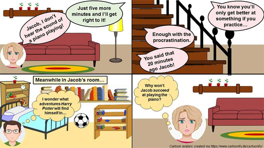 Så begyndte Jacobs mor sin typiske belæring. “Det sagde du for 20 minutter siden, Jacob! Nu er det nok med den overspringshandling. Du ved godt, at du kun bliver bedre til noget, hvis du øver dig …”