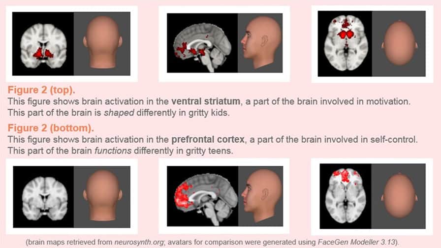 De fandt præcis, hvad du måske havde gættet: Grittier preteens havde mere funktionel forbindelse (eller samtidig aktivering) mellem det ventrale striatum og PFC. Så for at sige det enkelt, ja, gritty mennesker har samtidig aktivering mellem motivationsdelene af deres hjerner og planlægnings- og selvkontroldelene af deres hjerner [4]. I lyset af alle de beviser, der er fremlagt indtil nu, kan man undre sig over, hvordan vi kan få mere robuste hjerner og som følge heraf få mere succes. Hvordan kan vi blive disse højtpræsterende, jobbevarende, karaktergivende og fantastiske stavere? Ved at blive mere modige, ikke? Jo, på en måde.
