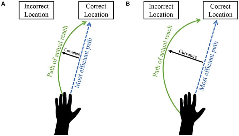 Disse ændringer er svære at observere med øjnene. Forskere har fundet en måde at registrere disse små og hurtige ændringer i vores bevægelser ved hjælp af en metode kaldet movement tracking. Der er et par måder at spore bevægelser på. Forskere kan registrere bevægelser på en computerskærm ved at bruge en computermus til at spore de bevægelser, en person laver. De kan også bruge sensorer placeret på en persons hånd. Når hånden bevæger sig fra et sted til et andet, sporer sensorerne den vej, hånden bevæger sig. Bevægelsessporing kan give mange detaljerede oplysninger om bevægelser, som vores øjne ikke kan se. For eksempel kan det vise krumning af håndbevægelsen, som er, hvor meget håndens faktiske vej afviger fra den retest mulige vej (figur 1). Når hånden buer mindre, er vejen mere lige og mere effektiv. Når bevægelser har meget krumning, betyder det typisk, at personen er mindre sikker på, hvor han eller hun ønsker at bevæge sig hen.