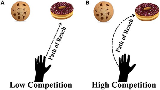 Vi kan tænke over, hvad det betyder, ved at gå tilbage til vores eksempel fra tidligere, hvor du valgte at række ud efter enten en småkage eller en doughnut. Forestil dig, at du kan lide både småkager og doughnuts, men at du lige akkurat foretrækker doughnuts frem for småkager. Forskere har vist, at i tilfælde som dette kan din hånd bøje sig en smule mod kagen, fordi du stadig tænker på den og overvejer at spise den. Men hånden bevæger sig tilbage til doughnuten, fordi doughnuten bliver det foretrukne valg (figur 2). Denne type bevægelseskurvatur opstår på grund af den konkurrence, der finder sted i hjernen, når man skal vælge, hvilken dessert man vil række ud efter og spise. Hvis valget i stedet stod mellem din yndlingsmad og din mindst foretrukne mad, ville din håndbevægelse sandsynligvis have en meget lille krumning væk fra din yndlingsmad. Med andre ord ville din bevægelse være mere effektiv, da din mindst foretrukne mad ikke konkurrerer med (eller bare kommer i nærheden af), hvor meget du nyder din yndlingsmad.